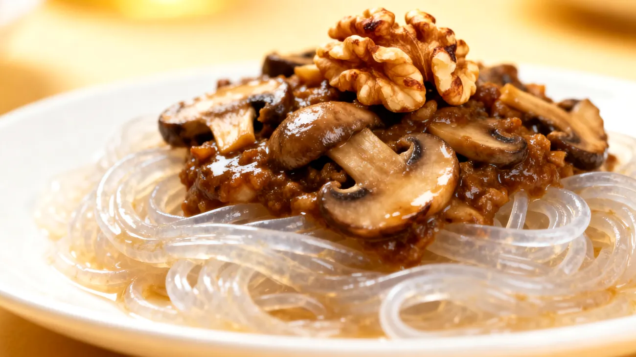 Die Kombination aus Konjac-Nudeln, aromatischem Pilz-Ragu und gerösteten Walnüssen schafft ein nährstoffdichtes Powergericht, das den Körper optimal auf die Nachtruhe vorbereitet.